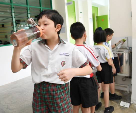 一些学校如西山小学,已禁止在校内售卖汽水和罐装饮料,鼓励学生喝白开水。(海峡时报)