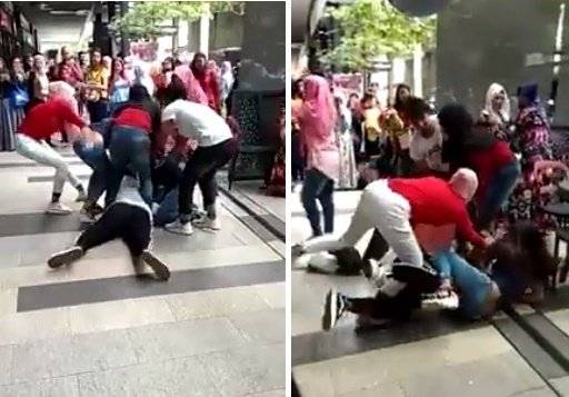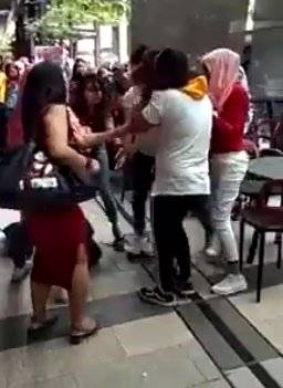 名女子在巴耶利峇地铁站外打架,五六名朋友要拉也拉不住。(视频截图)