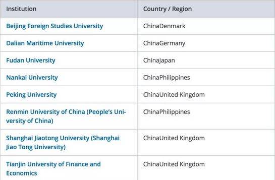 北京外国语大学、大连海事大学、复旦大学、南开大学、北京大学、中国人民大学、上海交通大学、天津财经大学。