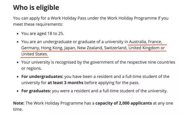 工作假期计划(Work Holiday Programme)适合于想在新加坡工作的学生或毕业生,必须就读于认证的澳大利亚、法国、德国、香港、日本、新西兰、瑞士、英国和美国的大学,年龄需在18岁至25岁之间。在新加坡居留和工作不超过6个月,每年限定2000个名额。