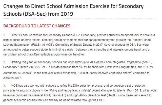 开通中学直入新加坡将从2019年起实行中学直接入学(Direct School Admissionfor Secondary Schools,DSA-Sec)政策,该入学政策为学生提供了基于自身才能、潜力和成就的入学机会。