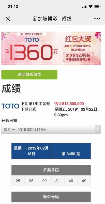 昨日通过新加坡微信平台,狮城便民微信官方账号,查阅新加坡多多“toto”获奖号码为:25,26,29,31,46,49,额外号码21,头奖161万5432元新币,整个新加坡乃至外围竟无一人获奖。