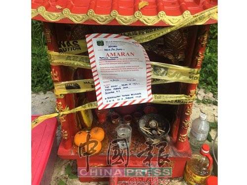 根据该照片,拿督公神龛被围上封条和警告通告。