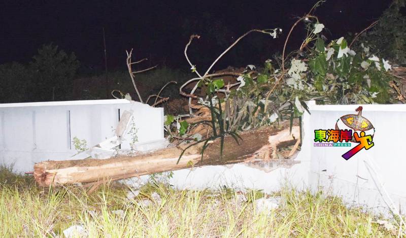 其中一棵大树桐冲破房屋的篱笆围墙,幸好没有冲进房屋。