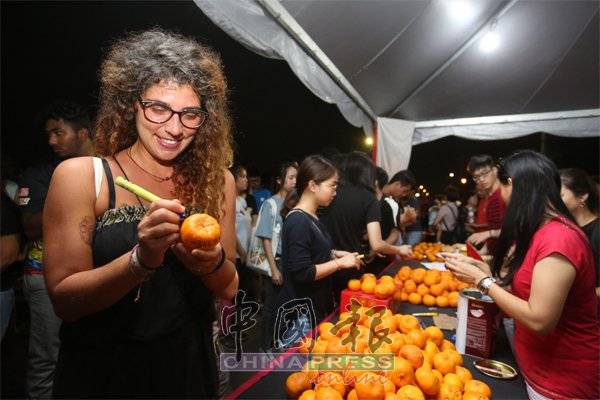 另外,槟州政府于周二元宵晚在旧关仔角举行“槟城庆典之璀璨元宵节”,外国女游客也参与抛柑活动。(pg190219kyxf16,摄影:纪允贤)