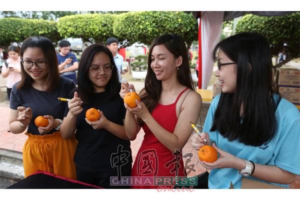 活动也吸引不少女生参与,她们把个人资料写在柑上,然后用力抛进海里,等待男生们把柑捞起,互相希望在新的一年里,可以结识有缘人。