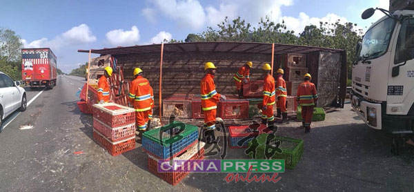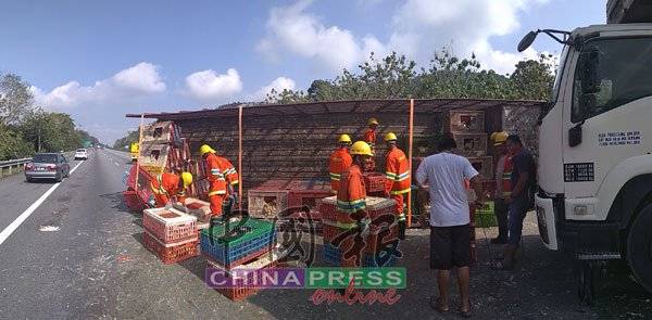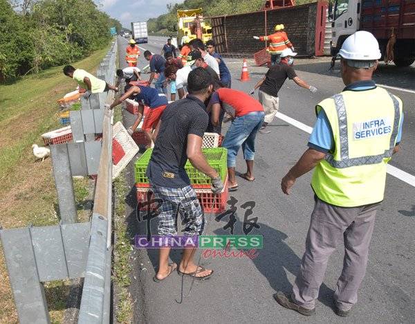 工作人员花逾两小时“抢救”鸡只,将部分掉落紧急车道旁斜坡的鸡笼及部分死鸡,搬至另一辆罗厘。