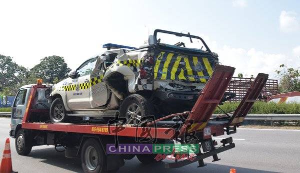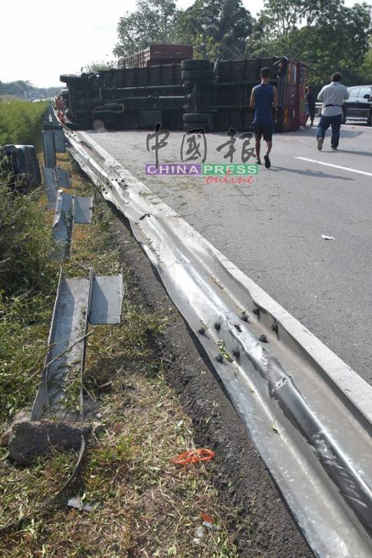 据了解,这辆10吨罗厘从雪州瓜拉雪兰莪出发,把生鸡送往马六甲万里望,途经事发地点时,罗厘撞上正停在紧急车道的巡逻四驱车后部,造成罗厘冲向右边,撞断路中安全岛的护栏,复横躺在大道上。