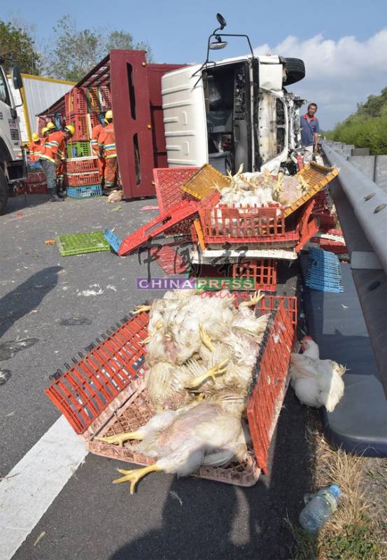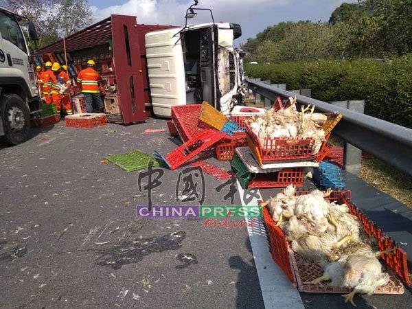 (马六甲19日讯)载生鸡的罗厘在高速大道发生意外,约千只生鸡活生生被撞毙,罗厘司机及大道巡逻辅警受伤入院,另一名辅警在抢救3小时后不治。