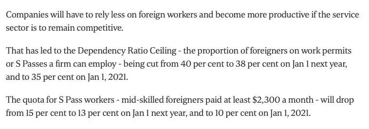 财政部长王瑞杰昨天2019年2月18日发表2019年财政预算案声明时说,明年1月起,服务业可聘用的中低技能客工,最多只能占公司人手的38%,低于目前的40%,后年1月则进一步调低至35%。