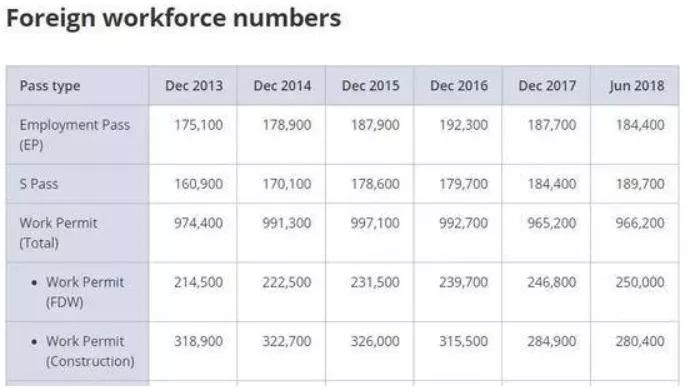 截至2018年6月新加坡外国劳工数量