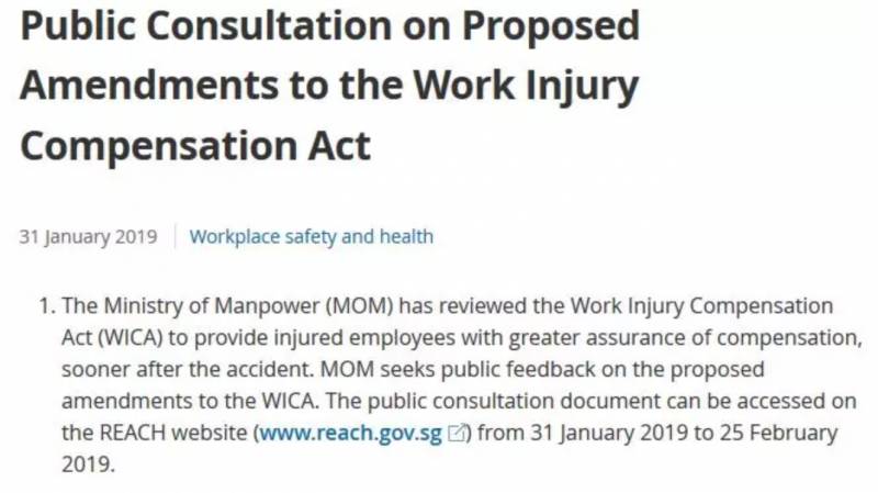 新加坡人力部1月31日发布公告,宣布就修改工伤赔偿法展开公共咨询,邀请公众和业内人士对修正建议发表意见。