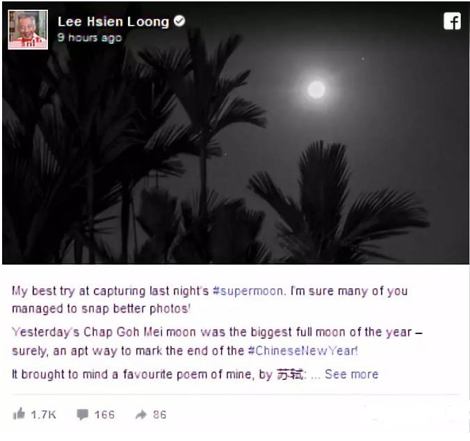 新加坡总理脸书晒“月”,不忘秀把英文版《水调歌头》...