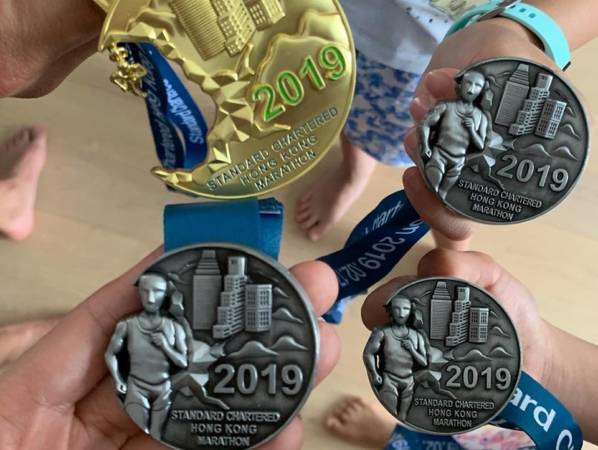 有参赛者跑完马拉松后,身体会酸痛至动弹不得,他们呢?她说:“晚上就会开始酸痛,应该是乳酸的出现,来不及排出去,运动员都会通过热身、滚轮、按摩,把乳酸排出去。我昨天另外还泡了热水澡,今天会去跑5公里,再把乳酸排一排。基本上小朋友的身体没有感觉,我是昨晚觉得脚酸痛,今天睡醒就好很多。刘同学(指老公)已经长时间没运动,比我们逊色一点。”