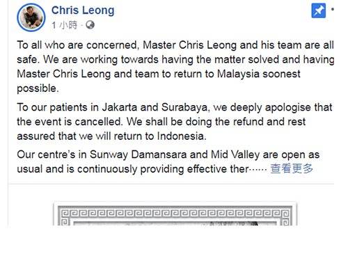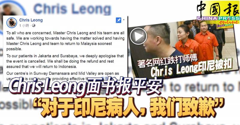 Chris Leong面书报平安 “对于印尼病人,我们致歉