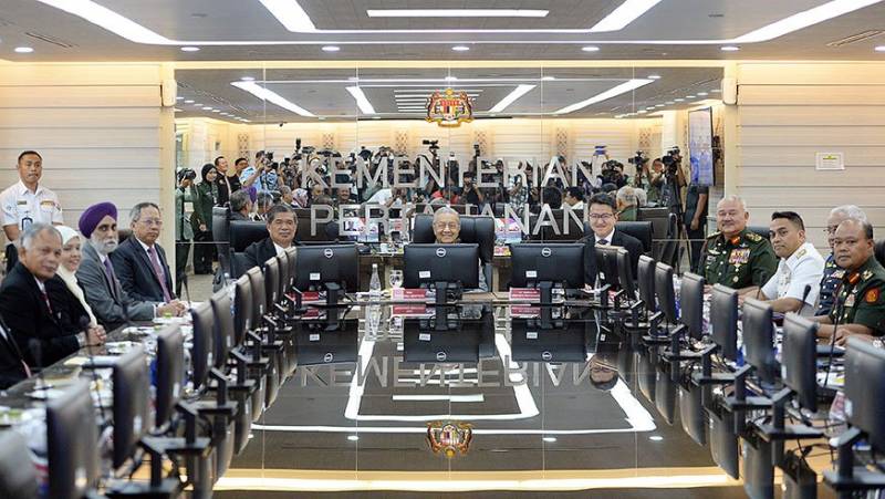 马哈迪(中)聆听国防部汇报2019年发展规划。左起为莫哈末沙布和刘镇东。防卫重点须转向打恐