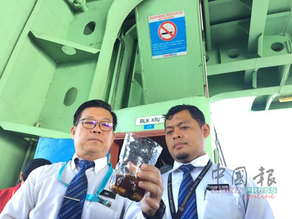 王勇元(左)和莫哈末纳英检查船员用来装烟蒂的“烟灰缸”。
