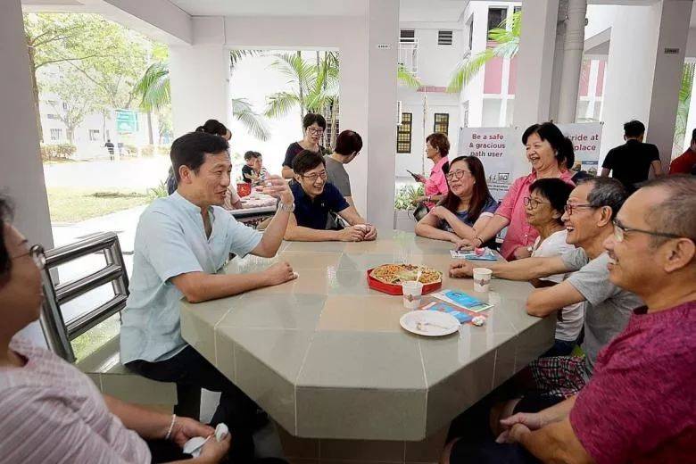 Ong Ye Kung(左)与Teo Ser Luck(左二)与森港居民会面。PHOTO:LIANHE ZAOBAO