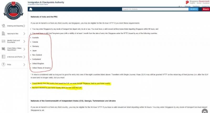 5. 如持上述国家单次有效签证出行且签证被使用,返程时亦可适用免签过境政策,但须从签证签发国直接赴新,且转机目的地须为中国。