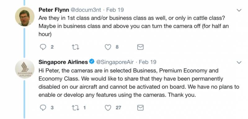另有人问到,是不是头等舱商务舱座位就可以选择关闭摄像头。新航回应,虽然摄像头全部都被禁用了,但是不管是商务舱还是经济舱,只有一些“特定的”,“被选中的”的座位才装着摄像头的哦~~(天选之人就是你了!)