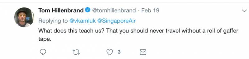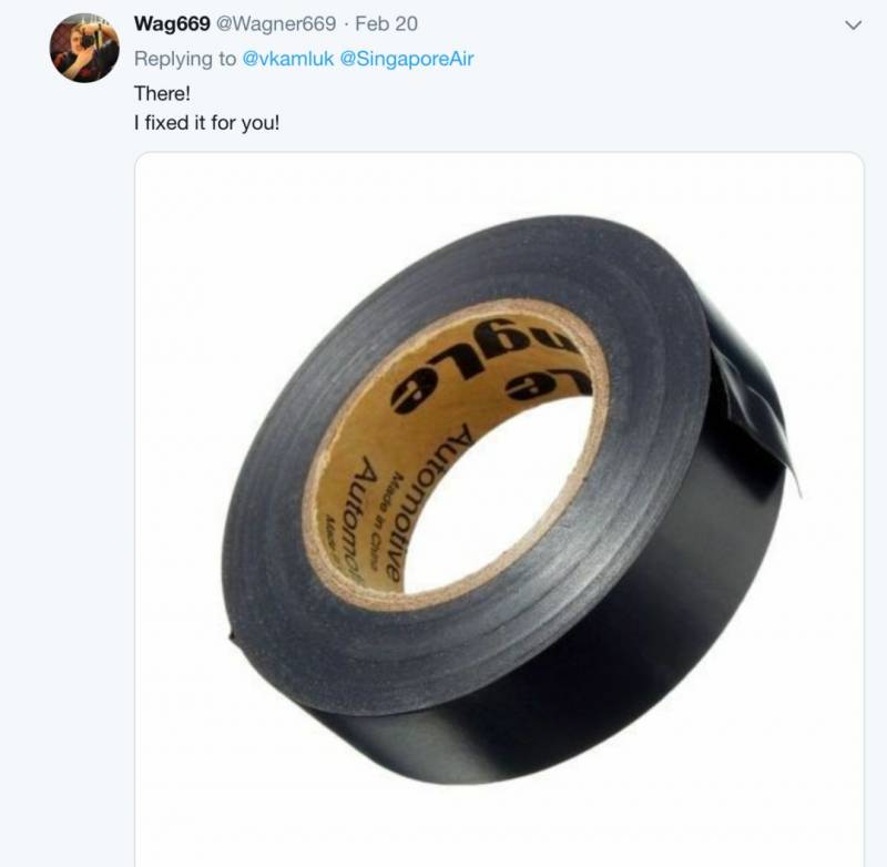 还有人说,以后没有带胶带,就不要坐新航的飞机了~