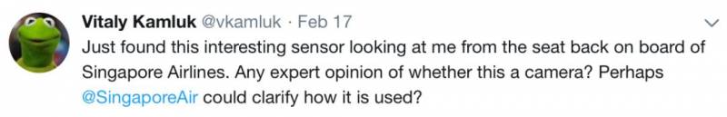 近日(2月17号),一名推特用户vkamluk发推@新航,表示发现了新航飞机上娱乐系统配着摄像头,而他表示很惶恐...