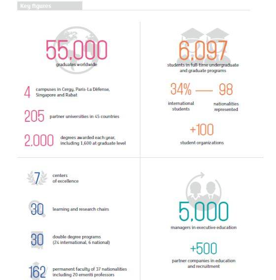 ESSEC 成立于1907年,在超过百年的建校史上拥有超过55,000名全球校友。在读学生6097人,来自98个国家。全球拥有四个校区,提供超过2000个学位课程,在全球拥有205间合作大学,其中与很多知名院校联办硕士课程,包括北京大学ESSEC双硕士项目,南洋理工大学ESSEC双硕士项目,澳洲昆士兰大学双硕士项目。以及包括清华大学,同济大学,复旦大学,香港中文大学,新加坡国立大学的交换生项目。全球拥有超过500间合作企业,其中包括法国知名品牌,包括路易威登(LVMH), 香奈儿,欧莱雅,爱马仕等,以及全球知名企业包括,谷歌,苹果,索尼 等, 都是学生实习和就业服务的合作企业。
