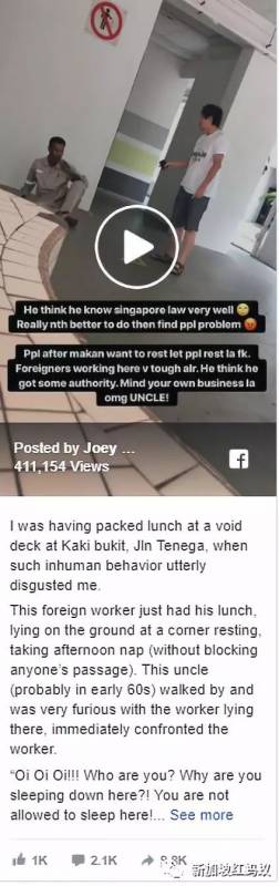 “如果你不赞成大叔的行为,请转发!这不是为了羞辱他,而是要传达这样一个信息:在任何情况下,当你看到外籍客工躺在那里休息时,任何人都不应该把自己当权威,向别人质问和吼叫!多么可耻的行为!“