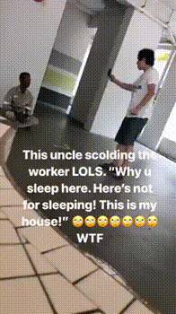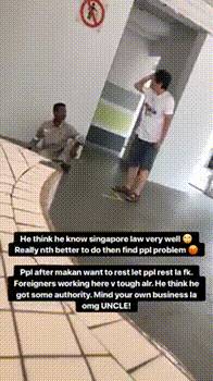 一客工吃了午餐躺在组屋底层小休,一位身穿白色T恤的新加坡大叔对此不满,大声对一名客工指指点点,指责他不应该躺在组屋底层的地上睡觉。