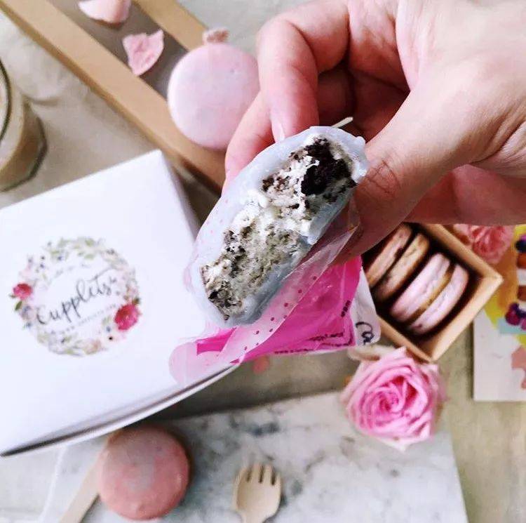 外面半裹以抹茶牛奶酱,再以抹茶片点缀