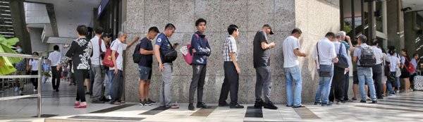 开出7次头奖和34次二奖的后港61街第685座的同益发投注站,人龙排到停车场。(陈渊庄摄)