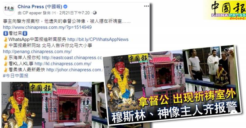 (吉隆坡23日讯)内政部长丹斯里慕尤丁谴责在巴生班达马英达花园祈祷室门口,放置“拿督公”神像的不负责任人士,并已指示警察总长丹斯里弗兹彻查此事。