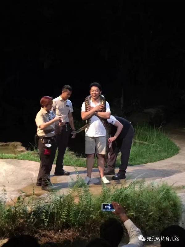 夜间动物园建议是乘车游览,但一开门的时候排队的人会很多,这个时候别着急,赶紧跟着标识牌往里面剧场走,先去找个好位置看表演,在节目中,表演的人和动物会到处走动,从各个角落不经意的就会冒出来,说不定就会出现在你身边哦。表演中还有和动物互动的机会,当时有个扛蟒蛇的互动,兜兜很想上去,拚命举手,但是兜兜当时太小了,最终让兜爸上了。那体验太难忘了,蟒蛇浑身冰凉的挂在我的身上。