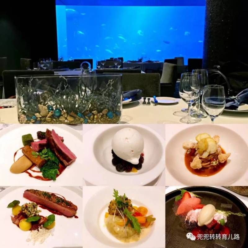 广告玩累了,下午比较热,刚好可以到水族馆溜达溜达。圣淘沙的水族馆,里面的深海景观区是整个水族馆的核心所在,透过他那宽达36米,高8.3米,厚70公分的玻璃幕墙可以观赏到5万余条各式各样的鱼,(这个玻璃幕墙也曾经是世界上最长的水族馆玻璃幕墙,现在被珠海长隆取代了)。兜兜每次到这个地方就不肯动了,好像这玻璃是带磁石功能,把兜兜吸在这了。水族馆里面有一家海底餐厅,中午提供简餐,晚上是比较正式的西餐并对着装有一定要求(男士不能穿短裤背心拖鞋凉鞋,最好提前订位)。
