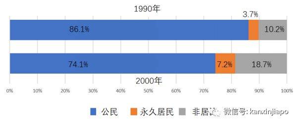 由于90年代加速引进移民,到了2000年,人口增至402.8万人,其中,公民占74.1%,永久居民占7.2%,非居民占18.7%。换句话说,在新加坡的每4个人当中,就有1个不是公民。