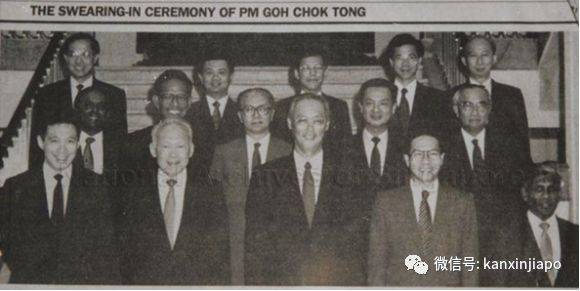 1990年吴作栋内阁,前排左起:副总理李显龙、资政李光耀、总理吴作栋、副总理王鼎昌、国家发展部长丹那巴南。(照片:新加坡国家档案馆)