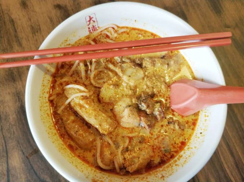 叻沙,里头有粗粉、蛤肉、丸子片、菜叶等,汤面还漂著红。朋友推荐我吃的时候带着坏笑,我疑心他有诈,追问著味道如何,他说你吃了就知道了。一口粉条下肚,朋友看着我的变换多姿的表情大笑。百度告诉我叻沙混合了椰浆、咖喱汤,口味是甜、咸、辣兼而有之,而材料里则丰富得很,包括蛤、虾子、鱼饼、南姜、白果等等。混乱的口感让我难以承受,腹诽著友人然后停筷。