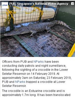 2月14日,一条大鳄鱼惊现实里达下段蓄水池,新加坡公用事业局即刻暂停该处所有水上和钓鱼活动,展开捕鳄大行动。