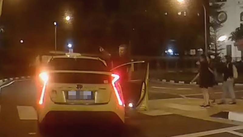 视频中可见,男子冲出马路的瞬间,德士司机也立即紧急刹车。男子双手挡着德士,后退两步后走向德士司机指指点点,看似很不满。