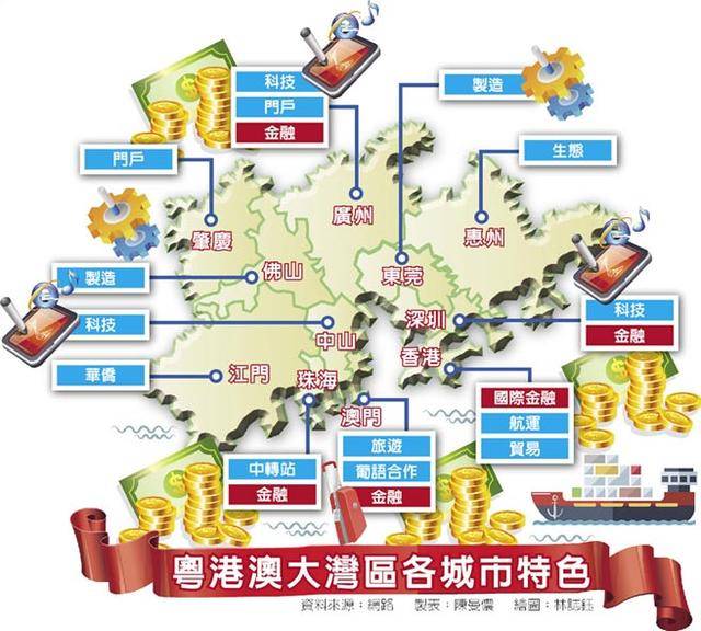 根据规划,粤港澳大湾区包括香港、澳门、广州、深圳、珠海、佛山、惠州、东莞、中山、江门和肇庆。珠三角各城市分工明确,香港负责金融贸易,深圳承载高科技产业和创新科技,澳门和珠海主打文娱服务,广州扮演行政枢纽的角色,其他内地城市承接制造业等其他产业。
