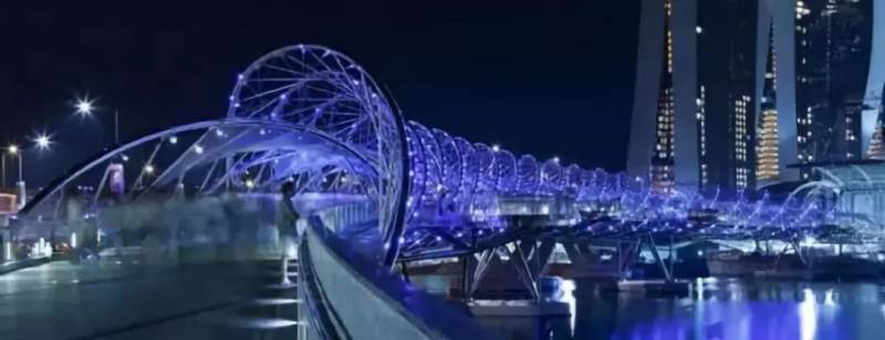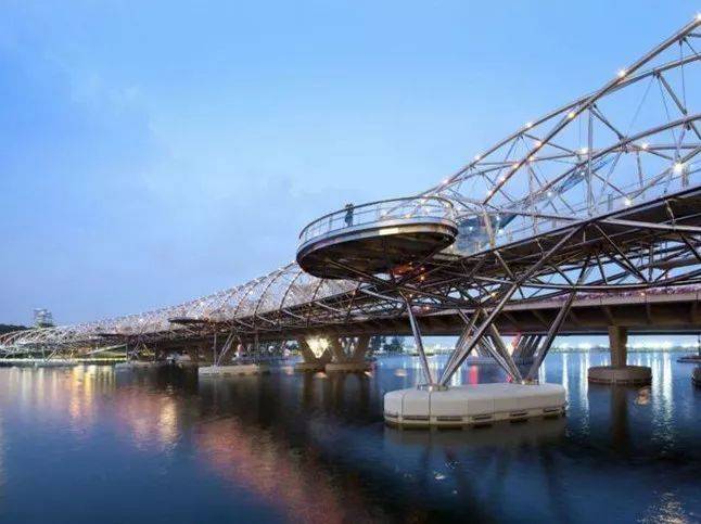 滨海湾双螺旋人行弯桥-世界上首座双螺旋结构的人行弯桥,位于滨海湾金沙所在地段。桥身的结构就像DNA的双螺旋结构,既可以均匀地支撑弧形桥身的重量,又象征了生命延续、更新和成长。