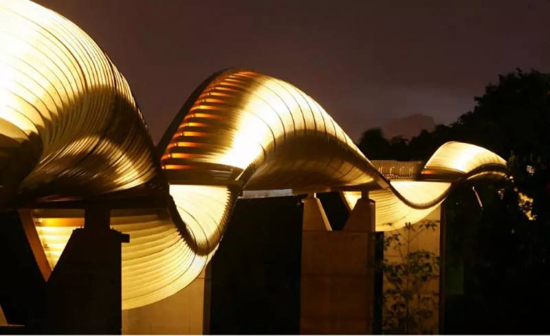 整个螺旋结构所用的钢条达2250米。而桥身由钢和玻璃顶盖组成,同时还建有五个以金木水火土为设计主题的瞭望台。到了夜晚,桥身会亮灯,并可配合不同节日营造不同氛围。