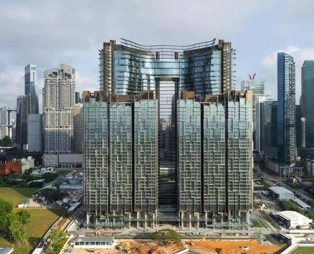 这个像个“凸”字,2矮一高,集住宅、办公和零售空间于一体,位于新加坡金融中心的大楼-Marina One。