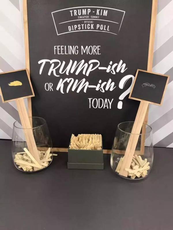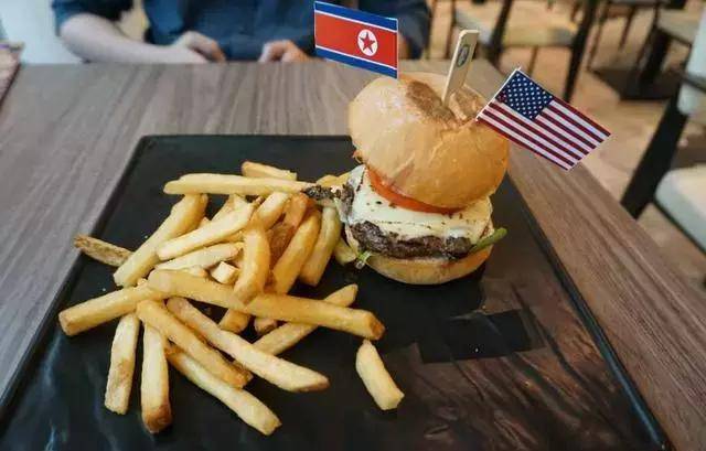 一家名为“屠夫厨房”的餐厅专门设计了“峰会套餐”——牛仔泡菜汉堡,即面包夹着象征美国的牛肉饼和象征朝鲜的泡菜,表面再插上美国和朝鲜国旗。这样一个汉堡当时卖到了18.8新加坡元(约合90元人民币)。