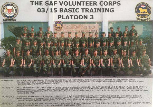 这是我们第三排的合照,左起第八位为Mike Tan上校,他右边持手杖的是志愿军总教官Ho Kian Lee,坐在第六位的女军官是Lee Peh Gee少校,左起第一位是我们可爱萌萌哒的Section Commander Alvin 上士。
