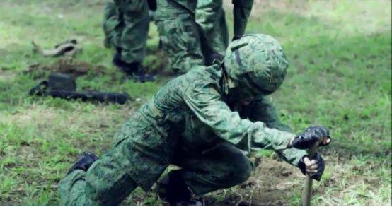 野外训练的第一课是如何使用face camou (油彩)抹脸,从描点、划线到涂抹,每一行的间距和颜色都有规定。抹完油彩我们被带到一片空地上,这里是今晚的宿营地,四面树林环绕。安顿下来之前要挖战壕、填战壕、搭帐篷、学习侦查、巡逻、处理生活废品的技巧。