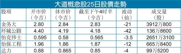 持有淡江大使大道(DUKE)的怡克伟士最低跌4.5仙至55.5仙。怡保工程(IJM,3336,主要板建筑)最低跌20仙至1.79令吉;该公司持有新街场大道(Besraya)、新班底大道(NPE)、加影-芙蓉大道(Kajang-Seremban Highway)以及建设中的西海岸大道(West Coast Expressway)。