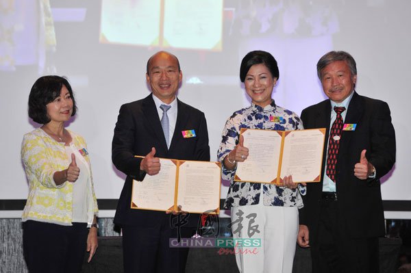 韩国瑜(左2起)与吕金珠竖起大母指预祝双方可在未来进一步促进合作关系。左起为见证签署仪式的洪慧珠及陈振贤。
