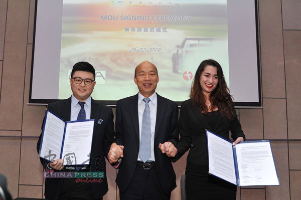 艾斯(右)与丁子斐签署合作谅解备忘录,由韩国瑜见证有关签署仪式。