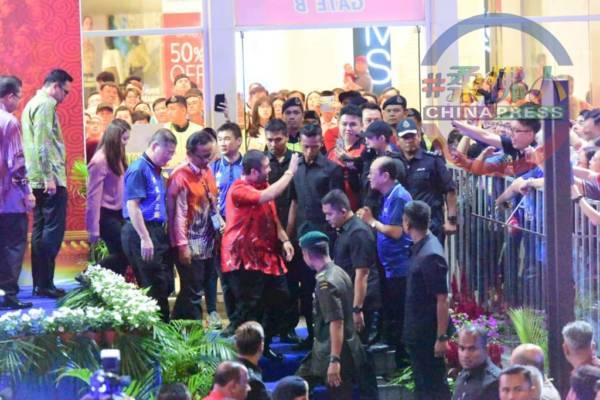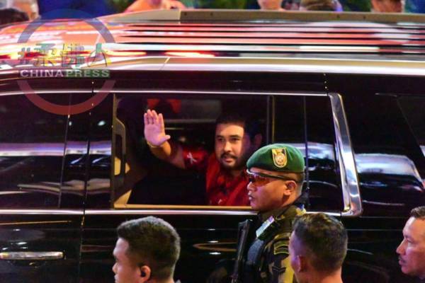 接着,殿下在柔州议会议长苏海占、新山中华公会会长拿督斯里郑金财及众州行政议员迎接,登上恭迎台,并向台下民众摇手示意。